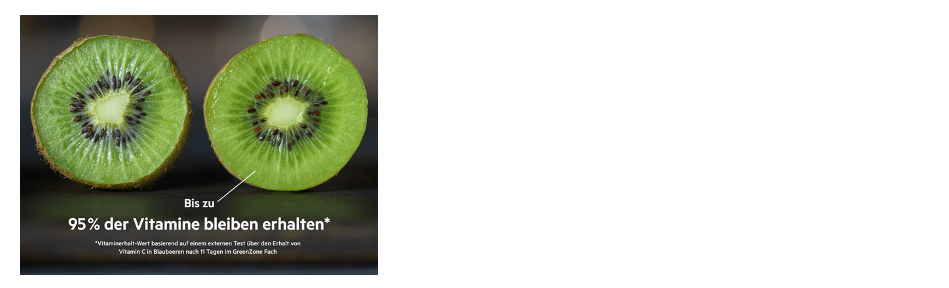 Die GreenZone-Klimaschublade verhindert die Bildung von überschüssiger Feuchtigkeit und sorgt für ideale Lagerung von Obst und Gemüse. Durch die optimale Einstellung der Luftfeuchtigkeit bleiben bis zu 95 % der Vitamine selbst nach 11 Tagen erhalten.