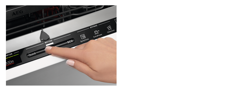 QuickSelect: Personalisierte Zeit-Steuerung. Mit AEG-QuickSelect bestimmen Sie mit nur einem Finger, wie lange die Geschirrreinigung dauert. Dabei zeigt Ihnen der Ecometer, wie ökologisch der gewählte Spülgang ist. Wählen Sie zwischen einem langsameren, aber energieeffizienten Programm oder bei Bedarf einem schnellen Reinigungsprogramm mit mehr Verbrauch. Passen Sie die Dauer des Programms per Wischgeste auf dem Display des Geschirrspülers an. So erhalten Sie immer das bestmögliche Reinigungsergebnis in der Ihnen gerade zur Verfügung stehenden Zeit.