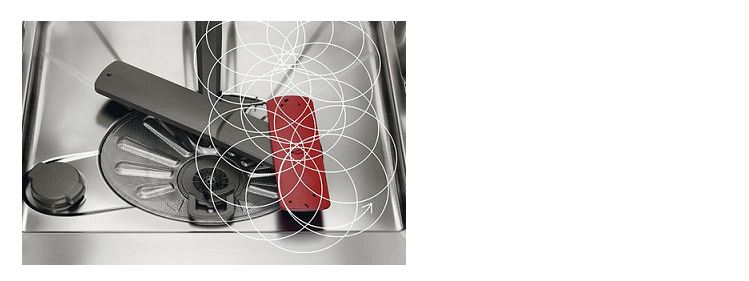 Der innovative Satelliten-Sprüharm entfaltet in Doppelrotation seine kraftvolle Leistung. Auf fünf verschiedenen Ebenen wird das Wasser so versprüht, dass es jede Stelle des verschmutzten Geschirrs erreicht. Das Sprühbild ist besonders dicht, da sich der Sprüharm auf besondere Weise um seine eigene Achse dreht.
