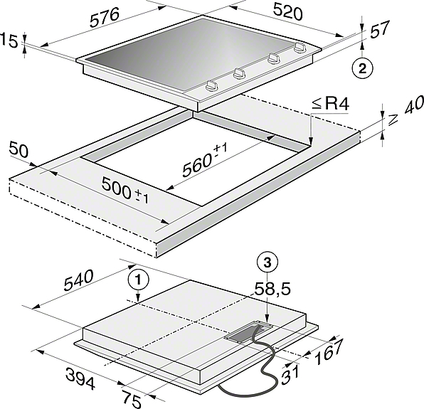- In 576 mm Breite mit Edelstahlrahmen für aufliegenden Einbau