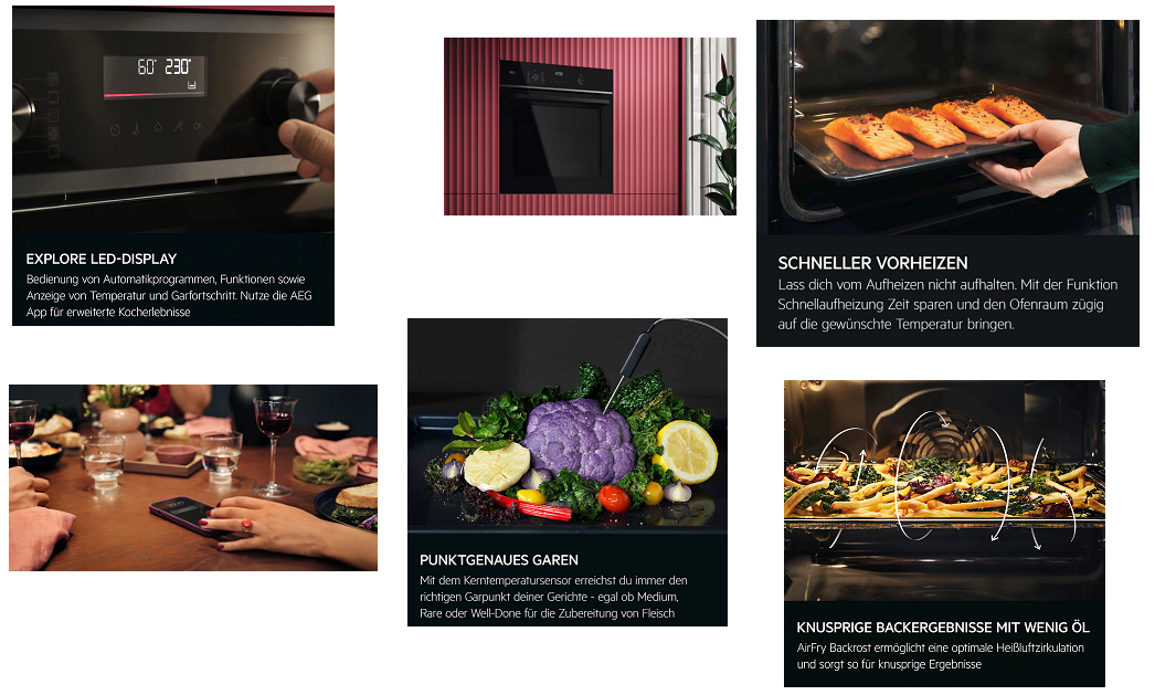 - AEG 6000 SenseCook® Backöfen mit Kerntemperatursensor und Automatikprogrammen garen deine Speisen zuverlässig präzise auf den Punkt. Ob Rare, Medium oder Well-Done - der Backofen teilt dir mit, wann deine Speisen den idealen Garpunkt erreicht haben.