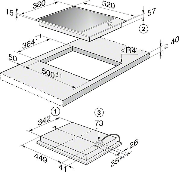 - In 380 mm Breite mit Edelstahlrahmen für aufliegenden Einbau