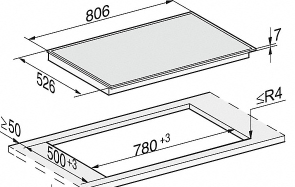 - In 806 mm Breite mit Edelstahlrahmen für aufliegenden Einbau