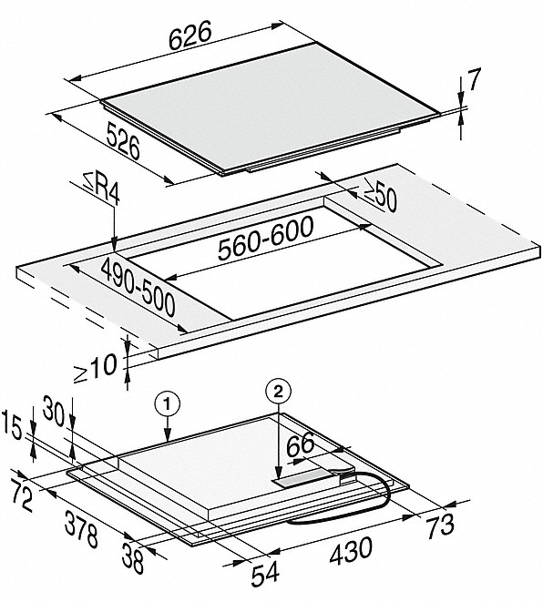- In 626 mm Breite mit Edelstahlrahmen für aufliegenden Einbau