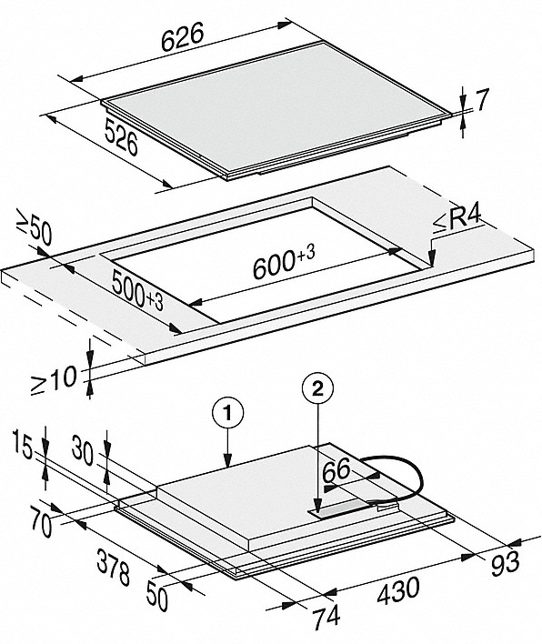 - In 626 mm Breite mit Edelstahlrahmen für den aufliegenden Einbau