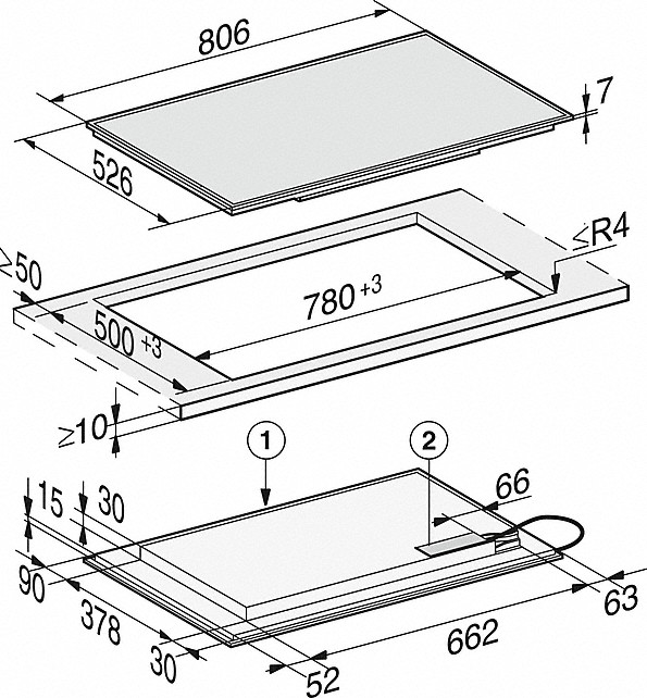 - In 806 mm Breite mit Edelstahlrahmen für den aufliegenden Einbau