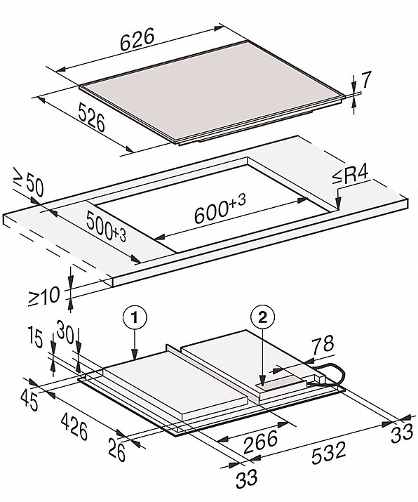 - In 626 mm Breite mit Edelstahlrahmen für den aufliegenden Einbau