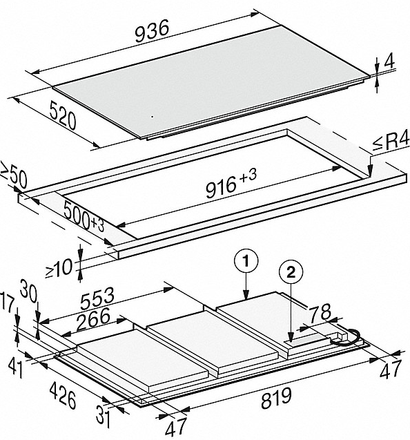 - In 936 mm Breite für den Flächenbündigen und aufliegenden Einbau