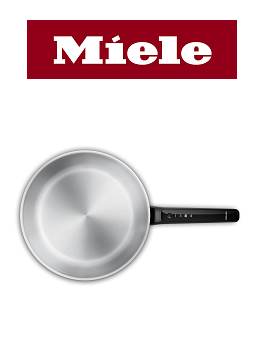 Miele Kochgeschirr für assistiertes Kochen auf Miele M Sense ready Induktionkochfeldern. Simple Bedienung direkt am Kochgeschirr. Dank integrierter Sensorik brennt nichts mehr an und kocht nichts mehr über. Topfdeckel bei Kochtopf mit seitlicher Dampfführung. Bratpfanne mit Superthermischer Sandwichboden für hervorragende Wärmeverteilung.